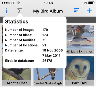 The statistics popover shows a count of the number of photographs, distinct birds, bird families, locations, the date range and the number of birds in the world bird list.